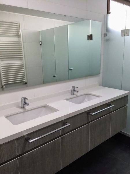 -Pisos madera de ingeniería en recibos y escritorio. Baños, cocina, logia y pasillos con porcelanato.