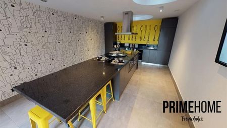 - Cocina equipada con mesón de cuarzo, microondas, refrigerador, cocina de vitrocerámica, horno, campana (todo empotrado).